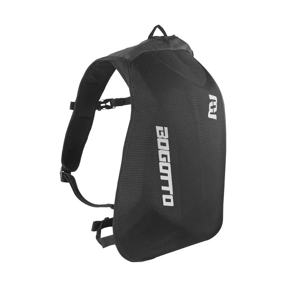 De Bogotto Hump is een gestroomlijnde, aerodynamische motorrugzak met een harde buitenkant, ontworpen voor stabiliteit en comfort tijdens ritten op hoge snelheid.